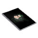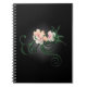 A notebook with an illustration of some delicate pink blossoming flowers with green swirlies and leaves on a black background with some glowing light gray shading around the flowers to accentuate and illuminate.