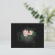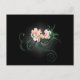 A postcard with an illustration of some delicate pink blossoming flowers with green swirlies and leaves on a black background with some light gray shading around the flowers to accentuate and illuminate.