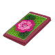 Green and pink floral image printed on trifold wallet is from a photo of an original crocheted creation designed handmade and Copyright © by published designer Delores Chamblin. The picture of the unique handcrafted creation with fancy stitches, flower, leaves and pearly button is reproduced on the billfold.
