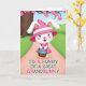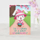 Designed with a sweet spring scene, this card features a white, human-like bunny with rosy cheeks and shiny dark eyes, smiling as if it’s sharing a private joke with someone special 🐰. It wears a bright fuchsia and pale pink outfit with a wide-brim hat that frames its long ears, along with a ruffled dress that adds a gentle, dressy touch. In its paws, the bunny holds a small woven basket with a teal rim, angled slightly forward like it’s offering a little treat to a friend. A peachy-pink path curves in from the foreground toward the bunny, guiding your eye through rolling green hills shaded in soft gradients. On the left side, a brown tree trunk rises with branches dotted in five-petaled pink blossoms, bringing in that early-spring romance 🌷. The greeting text sits low in the foreground, set in a soft, light-toned color that stands out against the path without overpowering the illustration. Overhead, a calm blue sky stretches across the background behind the blossoming tree and the bunny’s bright hat.