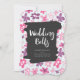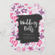 A fanciful wedding invitation with a cute floral pattern. Composed of pink and purple irregular shaped flowers in a retro sixties groovy style. Faint faded little blue hearts,