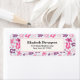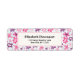 Address labels with a cute floral pattern. Composed of pink and purple irregular shaped flowers in a retro sixties groovy style. Faint faded little blue hearts, pepper the background on a pale blue backdrop. A cream colored frame layered over top which contains your name and address.