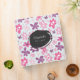 A personalized recipe (or other topic) binder with a cute floral pattern. Composed of pink and purple irregular shaped flowers in a retro sixties groovy style. Faint faded little blue hearts, pepper the background on a pale blue backdrop. A black hand drawn cirlce is layered over top, where you can personalize the text inside.