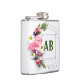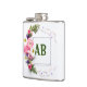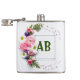 A white flask with a silver cap and trim, adorned with a floral design and the letters "AB" in green. The flask is rectangular with rounded corners. The floral arrangement is concentrated on the left side, featuring pink roses, white daisies, and small purple flowers, along with green ferns. The flowers are arranged in a cluster, giving a natural, organic feel to the design. The letters "AB" are centered within a square frame on the flask's surface. The background is plain white, which helps to highlight the floral design and the letters. The flask is well-lit, with soft shadows that give it a three-dimensional appearance.