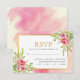 Pink watercolor flowers and leaves floral spring wedding RSVP card. This elegant design showcases a gold frame and pink watercolor flowers with succulent and eucalyptus leaves on the upper right and bottom left corners and your text in gold and black. Behind the frame there is a pink watercolor splash background.