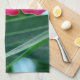 The original photograph by MaeFlowers on this brightly colored Kitchen Towel features pink flowers against a background of green leaves, with a touch of light blue sky showing through. The flowers have five wide petals which flare out and are rounded at the ends. Each flower has a very pale yellow center in a cone shape which blends into pink tendrils at the outer edges. Bring a touch of the garden indoors with this towel.