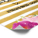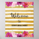 Poster print for welcome sign with pink fuchsia flowers design and faux gold foil stripes background.