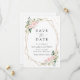 Invite friends and family in style and set the tone for your special day with this charming save the date card. Design features pink and white watercolor flowers, greenery, gold confetti and gold frame on white background.