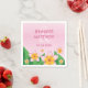 Tropical pink wedding theme paper napkins design featuring Destei's pink and orange color frangipani plumeria flowers illustration with green leaves. There are personalizable text areas for the names of the couple that is getting married and for the date of the wedding.
