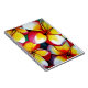 with original art design from watercolour painting by Sacha Grossel of tropical pink, yellow and white frangipani flowers in close focus, macro style. This bright, colourful, floral botanical design is reminiscent of summer, surf culture, hot weather and being near the beach.