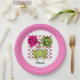 Pink Frog 6th Birthday paper plates are fun, colorful, great for girls who love frogs! Features a cute green frog wearing a polka dotted party hat, green and hot pink dots, balloons of pink and green that read I'm 6, and a wide border of pink on pink polka dots. You can easily add the sixth birthday child's name to personalize these frog theme paper plates. Look for the matching napkins, T-shirts, buttons, bags, and more!