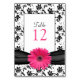 Use the personalize option to change the table number on these pink gerbera daisy black floral damask and ribbon wedding or other special occasion table cards. Please NOTE: You MUST change the table number on each card and add one of each number to your cart. If you want to do more extensive changes including changing the font, font color, or font size, use the customize option.