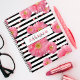 Beautiful personalized spiral planner design featuring pink Gerbera flowers on a black and white striped pattern. The text is fully customizable.