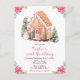 This elegant and festive birthday party invitation features a watercolor gingerbread house and beautiful pink poinsettia flowers. The text combines handwritten script and sans serif fonts for a stylish and modern look. The snowman, decorated pine trees and holiday wreath add a festive touch. This is perfect for Christmas birthday parties.