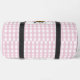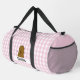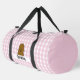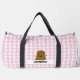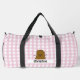 Adorable duffle bag featuring a cute happy cartoon brown potato. The background is a cute classic pattern of pink and white gingham. A template below the potato to add your name.