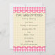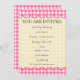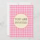 An invitation featuring a background of pink gingham. Hot pink trim. Personalize with information of your occasion over sheer cneter section. Opposite side features solid gingham background with sheer circle shaped frame. Text inside frame reads "You Are Invited."
