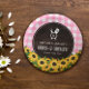 Rustic pink gingham bbq baby shower paper plates with printed wood grain, yellow sunflowers, and crossed grill utensils framing your initial.