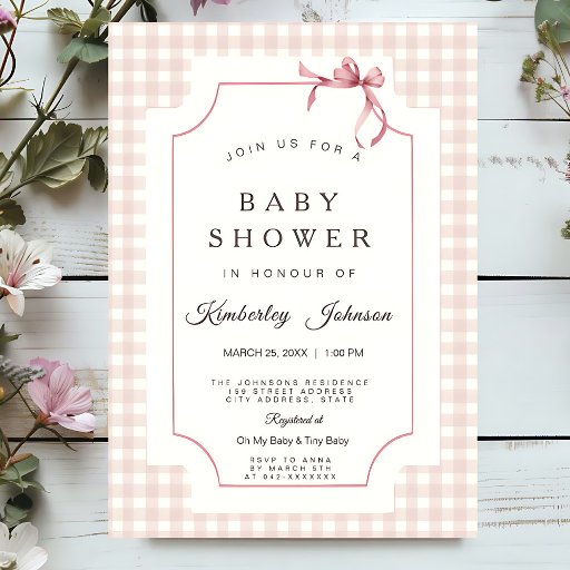 Welcome your guests to your baby shower with this acrylic sign, featuring a classic pink gingham border and back, elegant, gray script fonts, and a sweet watercolor bow at the top. Perfect for a country-style celebration, this sign is both warm and stylish.