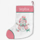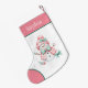 This cute design of a snowman or snow lady is dressed in a pretty pink and white gingham dress and hat with a green and white gingham bow. There is a place on the top of the stocking to personalize with a name. The pattern is on both sides of the stocking and the name can be put on both sides. This is a perfect design for young or teenage girls!
