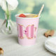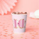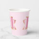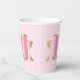 Paper cups with a glitzy shiny bow with gold outline and a faceted pink gemstone in the center. Feminine luxury glam style.