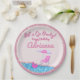 These glamorous and girly party plates feature a pretty pink Malibu Beach theme. Realistic looking water is pictured along the bottom, that resembles the crystal clear water of a tropical beach or pool. A cute pool chair and umbrella are pictured on the right, with a pink flamingo floatie on the water. A pink glitter frame encircles the plate.