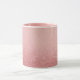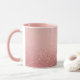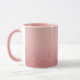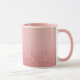 This is a Combo Mug with a pink interior. The top of the mug is a light pink color that becomes a sparkling rose gold glitter texture at the bottom. The glitter creates a shimmering effect with sparkles giving the image a glamorous aesthetic. The glitter particles vary in size and intensity creating a quality sparkle effect. The mug is a combo mug with a pink handle and pink interior.
