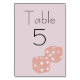 This glamorous custom table number card features a pink, feminine casino design. An image of large, pink glitter dice is printed across the center over a dusty pink background. You can personalize the table card to include your own custom name or text.