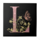Pretty pink glitter initial / letter L with gold leaves and swirls and coppery butterfly overlay on black background