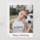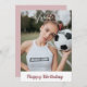 this is the perfect happy birthday card for football or sports lovers/soccer lovers, featuring a custom photo and name with a rose gold glitter happy birthday and the back features a football player with a ball with a rosewood pink background. who says football is for boys only!?