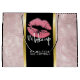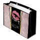 Gift bag with a background composed with a modern trendy rose gold tropical leaves pattern. Layered over top is a black frame with a gold gradient border, inside are pink glittery lips.