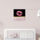 A poster with the bottom half composed with a modern trendy rose gold tropical leaves pattern.The top half has a black background with a gold gradient border between them, inside are pink glittery lips.
