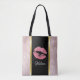 Personalized bag with a background composed with a modern trendy rose gold tropical leaves pattern. Layered over top is a black frame with a gold gradient border, inside are pink glittery lips.