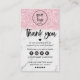 Pretty pink glitter marble business thank you for your order card. Social media icons can be deleted or moved around by clicking "customize further" while personalizing. Simple and modern with a script font. Change the color of hearts and stars if you wish.