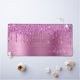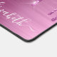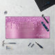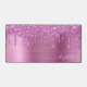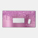 Custom monogram desk mat featuring pink faux glitter dripping on a pink faux brushed metallic background. Personalize with your name in an elegant white script with swashes.