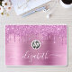Custom elegant and girly laptop skin featuring pink faux glitter dripping against a pink faux metallic foil background. Personalize with your name in a stylish trendy white script with swashes.