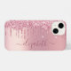 Custom elegant and girly iPhone case featuring dripping pink faux glitter on a pink faux foil background. Personalize with your name in a stylish trendy pink script with swashes.