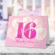 Here’s a fun, sparkly way for the birthday girl to show her appreciation to all who supported her milestone event! Send out this stunning, simple, festive, modern, personalized thank you note. A bold, graphic, hot pink glitter “16” and handwritten script overlay pink and gold balloons and gold sparkly string lights on a soft light pink background. On the front, personalize with her name. Type a custom note inside, or leave blank for your handwritten message. Great for the budding fashionista who loves modern glitter and glam and guaranteed to add a stylish touch to her correspondence!