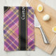 Pink, golden yellow and blue tartan design. Seamless pattern. Custom text and monogram.