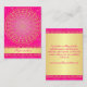 This exotic hot pink and gold wedding enclosure information card has a large central gold scroll circle medallion pattern on it with ornate swirled hearts detailing on it with gold stars and dots that lay over top of a fuchsia background with another layer of fine bright lavender purple swirls and scrolls on it. There is also a gold tone band across the bottom of the card that has customizable text on it. Use it as an information card, a wedding website or gift registry card, a wedding favor gift tag, a wishing well or charity card, or a directions or accommodations card. ****PLEASE NOTE that none of the elements on this card are raised or embossed. Everything is printed flat. This card would be perfect insert into your spring, summer, fall, or winter Indian, Hindu, or Muslim wedding or engagement ceremony invitations. PLEASE NOTE that if you change fonts, or the size of the font, some of the text may get cut-off. Everything will print as you see it on your monitor. I will not see your card and Zazzle will NOT correct anything (typos, alignment etc.). The text and paper type are customizable. If you need help with this card, please email me BEFORE you place your order. If you require any other matching items, or would like any other design elements added to it, such as Ganesh, or a symbol etc. please email your request to niteowlstudio@gmail.com.
