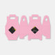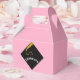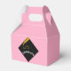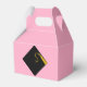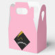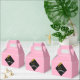Graduation party favors featuring black graduation cap with gold tassel on pink background.