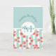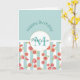 A birthday greeting card personalized with a name and monogram initial. Designed with a repeating digital pattern of pink grapefruits created with watercolors, set on a pastel green and white striped pattern. The top portion of the item has a pastel green background. A white circle with a gold colored border sits in the center and holds a personalized name and monogram initial.