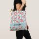 Personalized tote bag featuring a digital image with a repeating pattern of pink grapefruits created with watercolors, set on a pastel green and white striped pattern. A green border stretches across the bag with your personalized name inside. The bottom of the bag has more grapefruits on a solid green background.