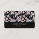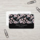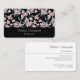 Business cards with an elegant pattern made with a watercolor illustration of pink flowers with blue-gray leaves and stems with a classy black background.