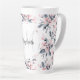 A latte mug with an elegant pattern made with a watercolor illustration of pink flowers with blue-gray leaves and stems.