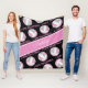 This cute volleyball themed fleece blanket for girls features the realistic image of a volleyball that has pink, gray and white panels patterned at an angle with the sporty font text phrase "I love volleyball" in pink that stretches between the angled rows of volleyballs - the volleyballs' pink and gray panels are blended with a girly kaleidoscopic pattern for a textured appearance - personalize her name in a sophisticated handwritten font on an angled chunky full width pink color strip - background is customizable black - by katz_d_zynes