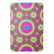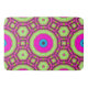A green, pink, and blue abstract with circles, hexagons, and lines