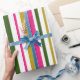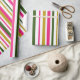 Modern stripped wrapping paper with white, green, gold and pink stripes of varying sizes. A modern yet retro look that is a great alternative the the traditional red and green of Christmas wrapping paper.