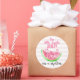 Cute pink watercolor one is a melon birthday favor sticker featuring a large watermelon slice and some decorative watercolor text on a white and pink striped background.