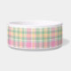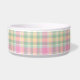Stylish dog dish done in white ceramic and graphics of a pink, yellow, white, and light green plaid pattern, around the bowl. Pink custom text, in the middle, is ready to personalize for your pooch. Great gift idea for anyone with a pet, comes in two sizes.