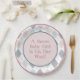 Super cute, pink, grey and white argyle patterned paper plates coordinate with the Baby Lambs Leaping Baby Shower Suite. Text reads "A sweet baby girl is on her way" in the center.